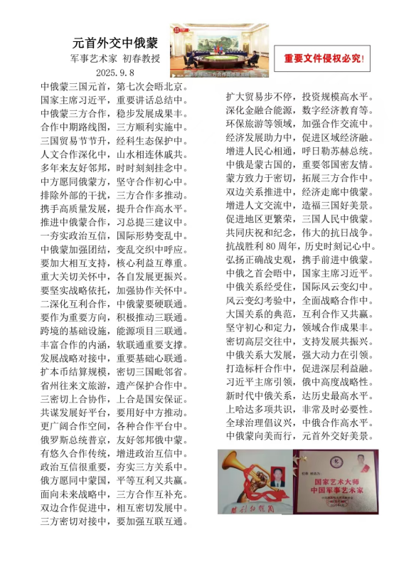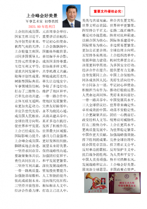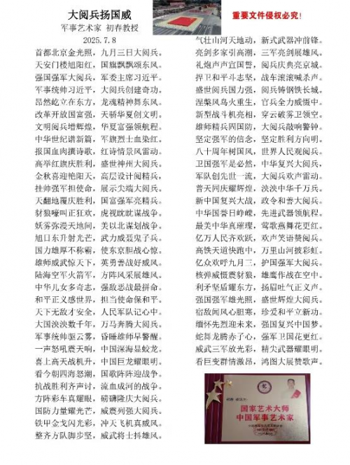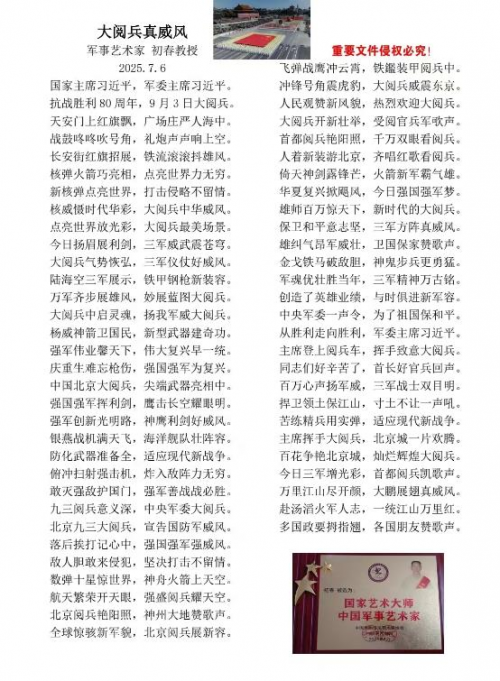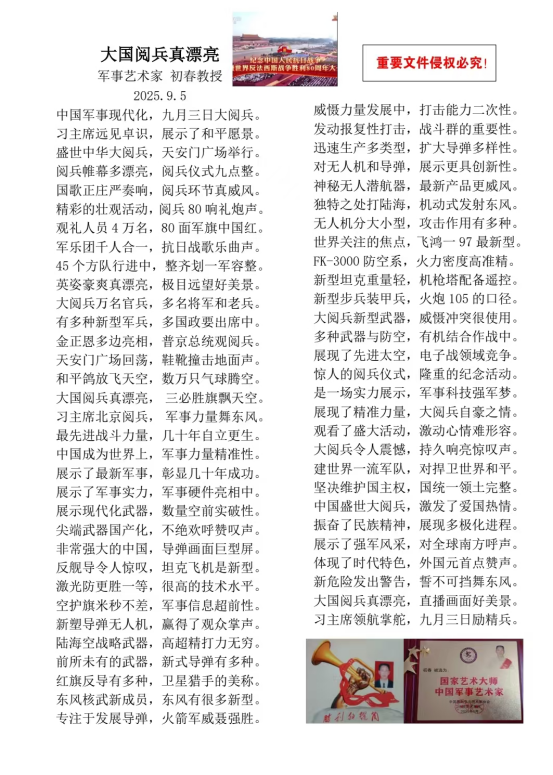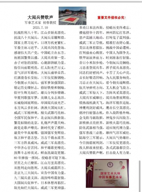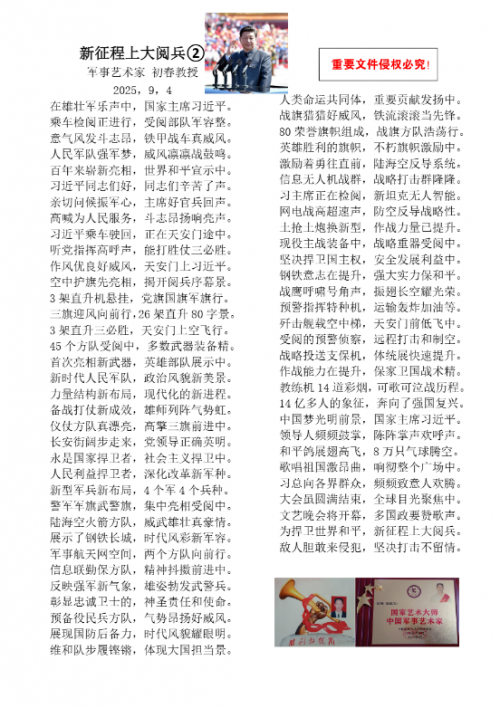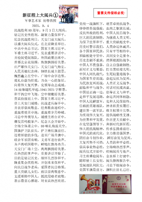 天安门前,铁甲生辉;长安街上,步履铿锵。抗战胜利80周年大阅兵,以现代化、国际化的雄姿向世界展示了一个文明古国的崭新气象。每一件大国重器都镌刻着和平的誓言,每一个铿锵步伐都丈量着复兴的征程。这场阅兵不仅彰显中国力量,更传递五千年文明积淀的和平理念一一以武止戈,以和致远。