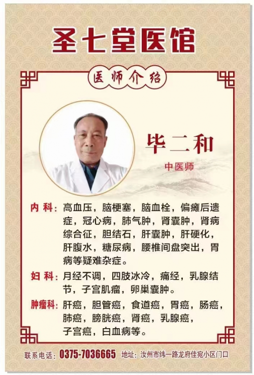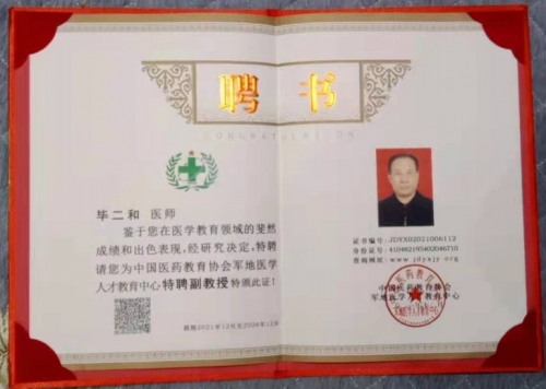 毕二和,男,69岁,从事中医40余年。1979年夏在纸坊卫生院跟随桂全朝中医师学习中医。1980年冬,前往汝州市中医院深造,拜祖传名医副主任中医师郑继卿名下为徒4年,期间曾任中药组组长。1983年春,卫生部中医司司长带队河南省卫生厅数十位领导莅临汝州市中医院检查验收工作,院领导命我代替中药师汇报工作,得到了国家领导的高度赞赏。84年从母院返里,考取中医士证,自理开设德仁中医诊所。1993年4月,出席国家科委组织召开的学术会议,发表论文“运用神经消癌散.治疗消化道癌症”。1995年考取乡村中医师证,同年受聘于寄料卫生院任业务长。2017年11月10日在北京注册了北京万舜祥中医药研究院。