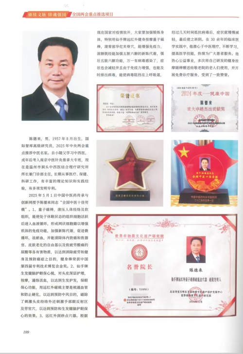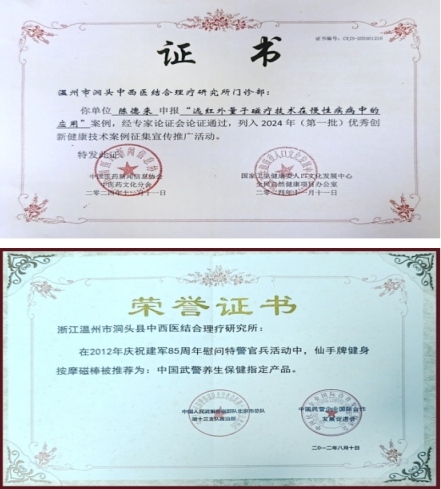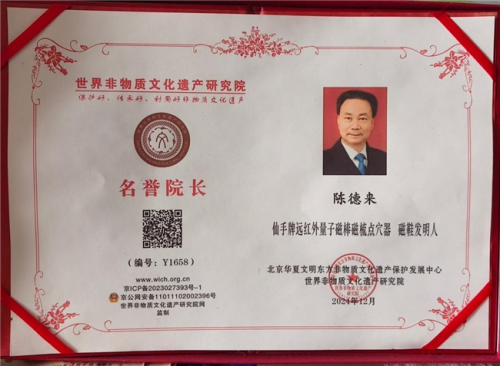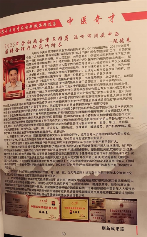 7、1995年在临床门诊中,一次偶然的机会见识了民间针刺放血师林瑞清,并亲眼见到林瑞清放痧救人的全过程,后来拜林瑞清师傅为师,并学习他为多种痧症治疗的经验。8、1996年《仙手牌防癌健身棒治疗腰、背、酸、胀、乏力有显效》论文在中华名中医学术交流会会上交流,论文证书经原国家医药管理局吕炳奎局长签名。9、1999年4月27日《健身棒的防癌作用机理与健身疗效及近十年使用后信息反馈》论文,在北京中国科学会堂“首届世界创新医学”大会上宣读论文,证书经原卫生部钱信忠部长签名,论文内容被大会录用和交流及授予卫生部批准的继续教育学分八分,该论文经专家组评审,被评为优秀论文金杯一等奖。10、1999年7月28日经浙江省医药管理局组织的浙江省中医院,浙江省人民医院等七个单位及七位专家对健身磁棒进行产品技术标准审定并制定了技术标准。11、2000年5月《仙手牌健身磁棒滚膀胱经等能祛风湿和补肾和强壮性机能》论文,被中华教育论文编辑部编入***书刊《中华医学临床研究第四辑》论文受《中华人民共和国著作权法》保护,并被中华医学优秀论文金杯奖专家评委会和中西医结合促进会审定,确认文章内容祥实,知识新颖,居国内外领先水平具有先进性、科学性和实用性值得推广应用。国家卫健委十三五全国重点课题温州市洞头中西医结合理疗研究所的磁疗仪系列产品对肿瘤、中风的预防。12、2000年7月份经浙江省医疗器械产品质量监督检验站准产注册检验合格2000年8月18日经中华人民共和国医疗器械认证注册。13、2005年陈德来又对健身棒进行了改进并又审批了新的专利2006年又获得了国家知识产权局专利授权、新的专利名称为健身按摩棒,比原来的更好了现已投入批量生产。全国都可以邮购。14、健身磁棒在2003年11月30日由中国医药文化研究会中国医药发展研究报告编篡委员会合办,并在人民大会堂召开的“中国医药卫生发展战略高层论坛大会上“仙手牌健身磁棒”被大会**指定的保健产品,并颁发了相应的证书。15、2015年又获得了最新的改进型的最新的专利证书,健身按摩磁棒201420715099.9,改进型在原有功能的基础上又加上了对心脑疾病有很好防治作用的特定磁场及特定穴位,对防治心脑疾病有更好的疗效。16、2017年1月2日参加北京《共筑中国梦–2016时代楷模公益慈善人物新春团拜报告会开幕式》。17、2017年1月被中央机关老干部文化交流中心授予“公益先锋”。18、2018年1月14日出席全国名老中医药专家2016年度传承工作总结会为中医事业“薪火传承”做出了积极的贡献颁发证书.19、受邀参加2019、2020中医药《春回大地》春节联欢晚会。