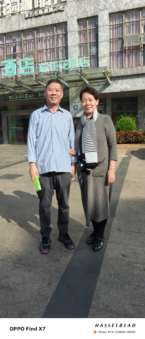 顾客买了我的仙手牌远红外健身按摩量子磁棒磁梳,老婆背着棒,老公拿着磁梳,高兴的合影。
