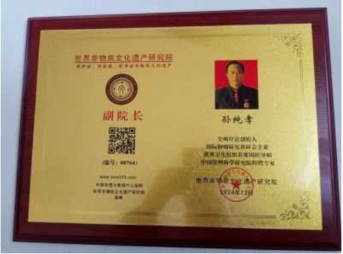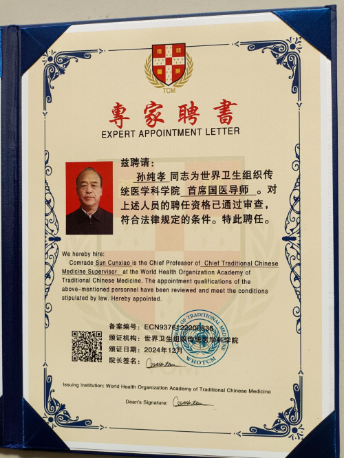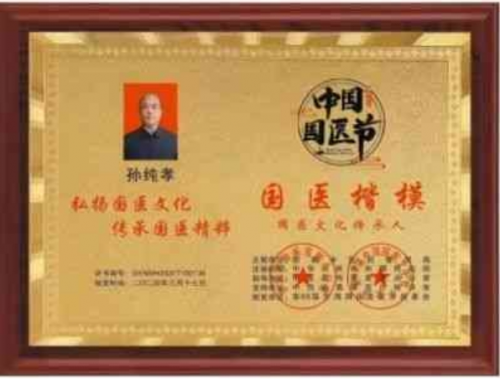 孙纯孝老师满怀赤诚的经营着中医的人生梦想,将自己的真情倾洒在中医学这块肥沃的土地上,用他独具一格的思维模式和行动魄力,铸造了一代中医名家的传说,善心行事全心奉献,在相融共生的历程中描绘出异彩缤纷的发展风景线。作为一位医务工作者,孙纯孝老师把中国中医继承好、发扬光大作为自己的奋斗目标。数十年不忘初心,一路前行,孙纯孝老师一直在践行自己肩负的使命造福民众,弘扬中医。在其全力奋进之路上,他做出了重大的贡献弘扬祖国的中医传统文化推动中医传统文化的发展,造福人类,孙纯孝老师作为中医行业内领先人物,用新一代的传承人精神去诠释中医的精髓,去发扬中医的光辉去传播中医的智慧,守护人民健康。传承好中国传统医术,惠万家幸福,助祖国强盛。