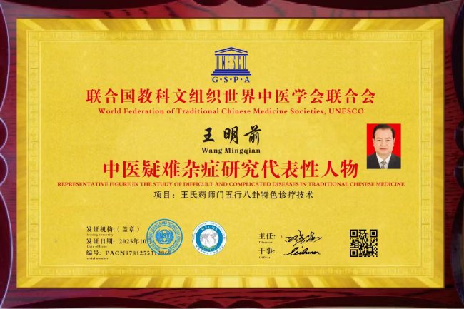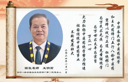 王明前,男,汉族,出生于 1943 年,四川省荥经县人, 祖 籍河南开封市。祖上历代都是中医世家和武术世家,王明 前医养生涯 60 余载。中医全科,中医特色调理师,中医高级健康管理师,高级道医诊 疗师,中医特色调理师,高级公共营养师,气功教师,武术教师。王明前系王氏药师门五行八卦诊脉法第十四代传 人,王氏药师门五行八卦点穴麻醉无痛无创接骨术第十四 代传人、王氏药师门五行八卦针灸秘笈术第十四代传人、王氏药师门五行八卦点穴推拿术第十四代传人、青城华美 国际康养中心首席专家、四川五行慧源康复服务有限公司 董事长、中国抗癌协会会员,世界首席健康专家、王明前 五行八卦世界知名品牌、点穴麻醉无痛无创接骨特色疗法 创始人,速效接骨丹发明人、中国民间中医医药研究开发 协会浊毒理论分会第一届理事会常务理事、中国民间中医 医药研究开发协会培训部基层中医药推广使者、国医网主 任委员、中关村健康服务产业促进会专家委员会委员、中 国医药教育协会医促会特色疗法专家、建国 70 周年全球 100 家媒体推荐当代名医王明前国际特色疗法专家。 2022 在全国老字号遴选中,传统医药类王氏药师门家传秘籍、王氏药师门五行八卦诊脉法、王氏药师门五行八卦针灸秘 籍术、王氏药师门五行八卦点穴麻醉无创无痛接骨术、王 氏药师门五行八卦点穴推拿术历史悠久,技艺精湛,取得 社会广泛认同,荣誉入选,中华老字号。中国民族卫生协 会难治病专家委员会难治病专家委员,中国康复医学会会 员。