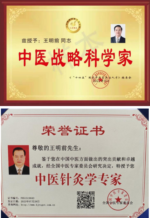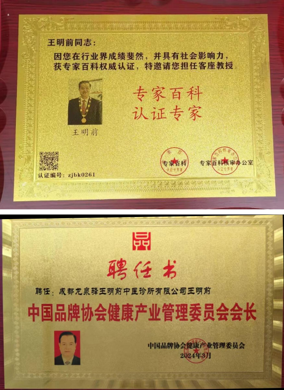 王明前:四川王明前医疗管理有限公司首席专家顾问:上 海中医药大学博鳌国际医院特技专家;修正药业集团中医 专家顾问;王明前医疗管理有限公司首席专家顾问;中国 民间中医医药研究开发协会浊毒理论分会常务理事;中国 民间中医药研究开发协会推广使者;中国医药教育协会医 药产业创新发展促进工作委员会专家委员; CCTV 当代名医 栏目组特邀专访嘉宾;中国当代发明家;五行八卦世界知 名品牌;建国 70 周年中医药亮剑人物;中医绝技万里行创新人物等。