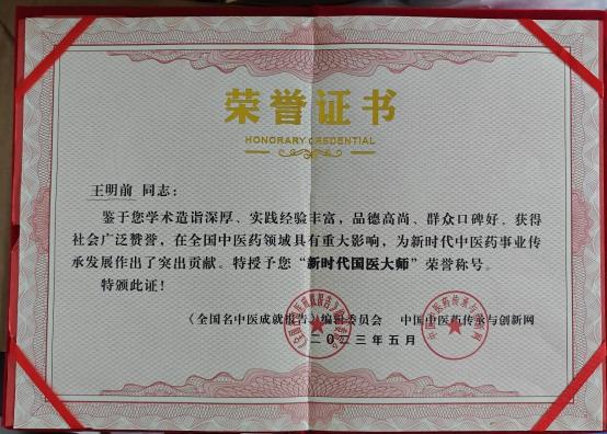 王明前希望将中医药文化发扬光大,亲传弟子 40 多人。王 明前不想把自己对中国中医的探索和领悟出来的一些有效 的治病手法付之东流, 所以希望更多的人传承发展, 来造福 于天下苍生,有希望把它发扬光大。现特面向社会传徒授艺。 将祖传特技贡献给人类健康事业。中医自古就是口传心授, 勤于实践。有些技能非书本表达完全, 愿传有爱心厚德者, 使其光耀中华、走向世界。
