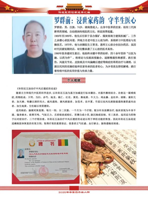 1990年,罗群前投身建材行业,但他对中草药的钻研从未间断。四十余年来,他始终坚守“以医为趣、以药为伴”的初心,将中医理论与临床实践深度融合,不断摸索、总结经验,逐渐精通伤寒感冒、跌打损伤、风湿关节炎、皮肤病及中风偏瘫后遗症等多种病症的草药治疗与调理方法。他凭借源自民间的实操经验和世家传承的医者仁心,默默为乡邻亲友排忧解难,用实际行动践行着传统中医的实用价值与传承力量,赢得了身边人的广泛赞誉。
