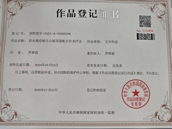 历经五十余年的潜心钻研与临床实践,罗群前将祖传秘方与自身临床经验相结合,研制出防治温疫的特色方剂——山银花散。2024年,他为这一祖传秘方申报了中华人民共和国国家版权局作品登记证书(国作登字 2025-A-00205398),以法律形式守护这份中医传承的珍贵成果。