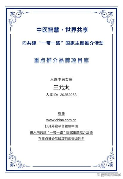 随着中医药“走出去”战略的不断推进,王允太的事迹和理念也逐渐引起国际同行的关注。在入选“一带一路”国家主题文化健康品牌推荐项目后,他所代表的不仅是一个医生的荣誉,更是一种文化的背书,一种文明的传递。他将继续秉持“人民健康为本”的信念,以仁心仁术为桥梁,推动中华医道在更广阔的平台上传播与落地。