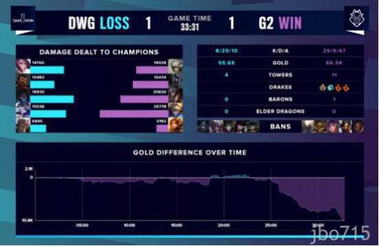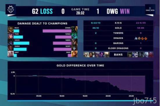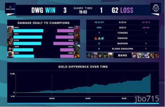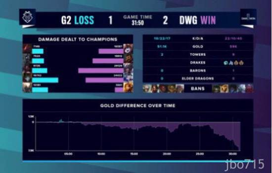 带着大龙BUFF的DWG直接突破G2的下路高地,G2出门追击被DWG五人蹲到,击杀三人,DWG一波带走比赛,拿到赛点。
