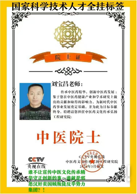 国医创新宗师刘宝昌2018年荣获中国改革开放40周年医疗行业突出贡献人物。2019年荣获建国70周年医学界楷模,刘宝昌大力倡导,尊医重药,人人有责。中国健康,中医为本。根治万病难题必须中医中药。中医学.“理法方药症量效,博大精深悟活意。三纲五部再构建,新法万机更系统。新字当头先鉴源,科学中医创新难。继承发展频频行,源头创新滚滚来。”生命科学,强基固本。中国中医学是正宗国医,中国中医学是全科自然科学技术体系。