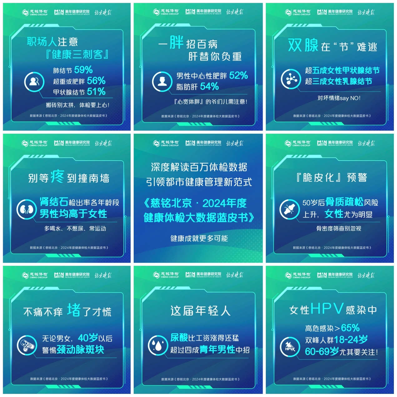 会上,慈铭体检与中关村美年健康产业研究院、北京晚报联合发布《慈铭北京·2024年度健康体检大数据蓝皮书》(以下简称《蓝皮书》),通过持续追踪区域人群健康趋势,期望为公共卫生研究提供动态观测窗口,为医疗机构优化疾病筛查路径提供参考基准,助力公众提升健康风险认知水平。现场还发布了体重管理、血糖管理、“磁控胶囊胃镜系统”机器人PRO升级版三款健康管理创新产品。通过智能技术赋能与定制化服务体系的深度融合,构建差异化解决方案,为公众提供更具针对性、高效性的健康管理工具,助力提升全民健康素养。