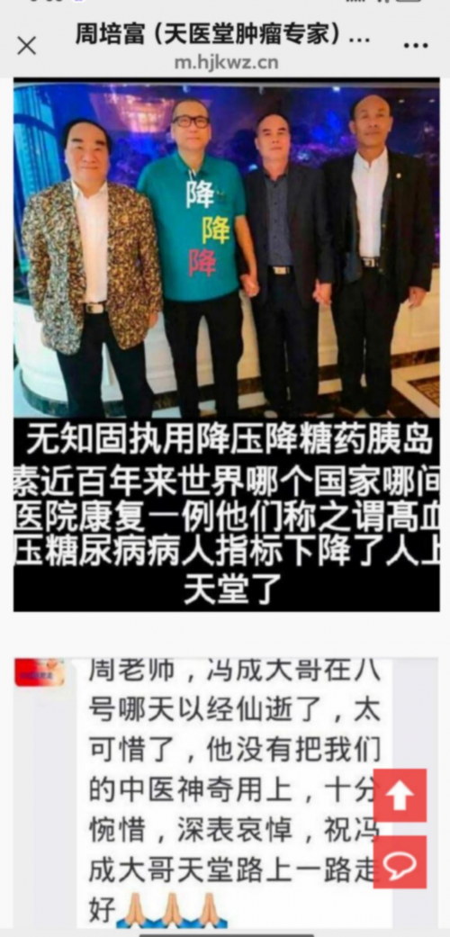 冯某先后在世界各国最现化最先进医院众多的医学专家,教授,博士近百次的联合会诊,用当今最流行的欧美认证欧盟标,抽血,取肉,活检化验,执行最高标准用药,如降压药,降糖药,胰岛素注射,干细胞干预,十多年的现代化手段治疗花耗巨资后,在(香港)升天。