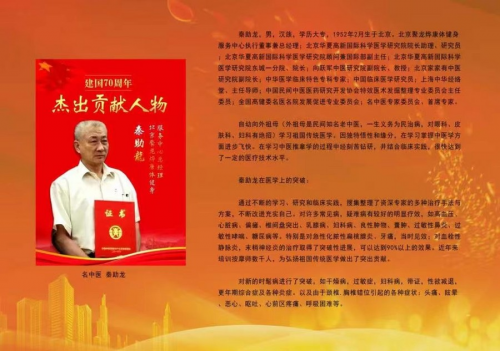 2021.02..获《百年风云*党耀中华--新时代中华好儿女》荣誉证书,获;《新时代中华好儿女.金箔木匾一块》中国科学文化出版社出版的《百年风云*党耀中华--新时代中华好儿女》第422--425页刊登了(悬壶济世继承创新--及秦氏经络按摩创始人秦助龙同志。)