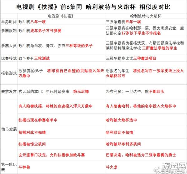 近日,由杨幂、阮经天领衔主演的小说改编古装电视剧《扶摇》正式开播,这部剧在开播前就攒足了期待值,首播也收获了近4亿的播放量。然而日前却被网友指出该剧剧情与《哈利波特与火焰杯》极其相似,不少哈迷都将其中