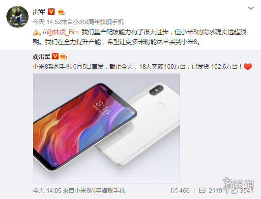今日,雷军微博发文称:“小米8系列手机6月5日首发,截止今天,18天突破100万台,已发货 102.6万台!”随后小米科技联合创始人林斌转发了这条微博,并评论道“我们量产爬坡能力有了很大进步,但小米8