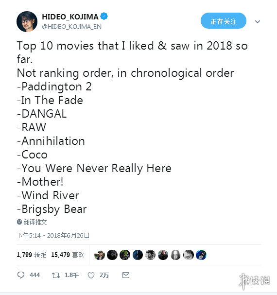 众所周知,小岛秀夫除了是知名游戏制作人,还是一位电影爱好者。昨日,他在推特上分享了2018上半年看过的新电影TOP 10(日本上映日期有所不同),小岛表示这次的排名不分前后,只是观影顺序。一起来看看小