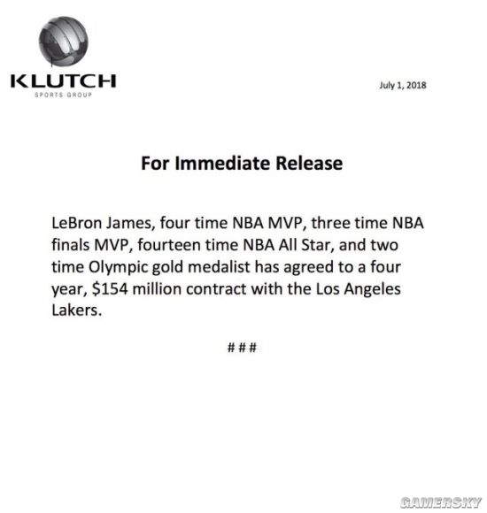 北京时间7月2日,勒布朗-詹姆斯的经纪团队正式宣布,詹姆斯与湖人达成4年1.54亿美元口头协议,其中第四年为球员选项,双方将等到当地时间7月6日合约冻结期结束后正式签约。2018年休赛期最大悬念至此揭
