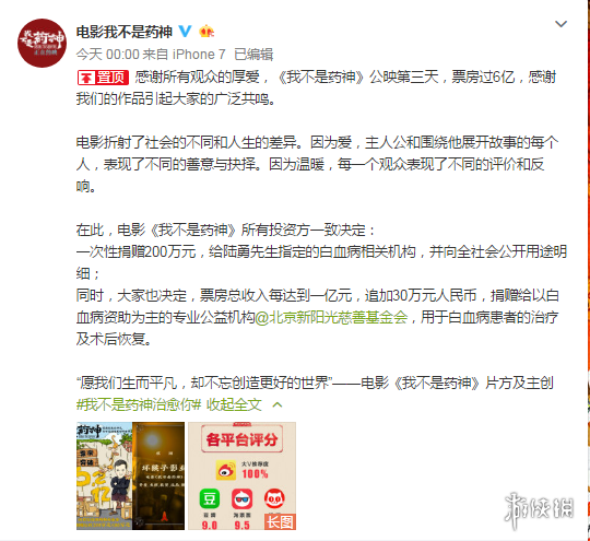 今天,电影我不是药神官方微博宣布《我不是药神》公映第三天,票房过6亿! 为感谢广大群众的支持,电影所有投资方一致决定一次性捐赠200万元,给电影原型陆勇先生指定的白血病相关机构,并向全社会公开用途明细