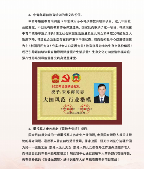 19岁被选为当地【人大代表],24岁担任卫生所所长,创办过青少年心灵成长学校,开设的中医养生院远近闻名。而在2021年,他又重新开始创业,全力筹建【中医康养院]【雷锋光荣院]【中医养生养老院】三家康养养老机构。 作为一位颇有建树的名医,宋东海总是不满足于现状而上下求索,他说,“生存不是生活,打打工、挣挣钱,真正的生活不是那样,做利国利民的事情,才是人活一世最好的事这也成为他一生奋斗的写照,人民的身心健康就是他一直追求的终极梦想。