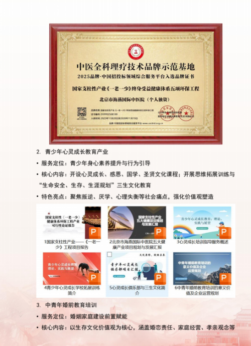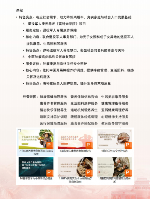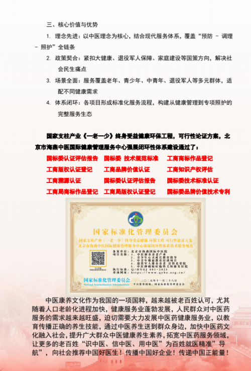2021年初,再一次开始创业,凭借家族四代中医相传、个人行医42 年、拥有20个专业技术职称、中医专业知识和临床经验丰富的优势,经地方政府、民政部门和退役军人事务部门批复了“中医康养院”、“雷锋光荣院”、“中医养生养老院”三家康养养老机构,现正在建设中。引入智慧养老和中医康养理念,为地方老人和退役军人的康体养生、养老保健、心理抚慰、生活起居提供帮助。经营范围有:健康保健指导服务、营养保健信息咨询、中医理疗服务、生活美容服务、保健食品、中西药品、生活照料服务、老年护理服务、心理精神支持服务、协助医疗护理服务、医疗保健预防服务、指导安宁服务。主要模式为:老人的衣食住行、吃喝玩乐、吹拉弹唱、琴棋书画、询医问药、推拿按摩、针灸理疗、刮痧拔罐、膳食营养、心理咨询、身体健康信息安全监控等落地式服务项目。