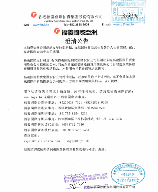 福羲国际拍卖集团股份有限公司发表声明,福羲国际近日发现,有与福羲国际拍卖集团股份公司无关或未经福羲国际拍卖集团股份公司授权的公司,向公众冒充福羲国际拍卖集团股份公司管理层及业务经理举办征集活动甄选拍品。凡未经福羲国际拍卖集团股份公司授权的公司”开展的公开宣传、营销并组织拍品征集、举办拍卖会等活动与福羲国际拍卖集团股份有限公司无关。
