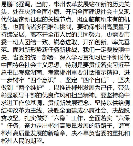10月19日,郴州市2020年第26次市委常委会会议召开,郴州市委书记易鹏飞宣布了省委人事任免。