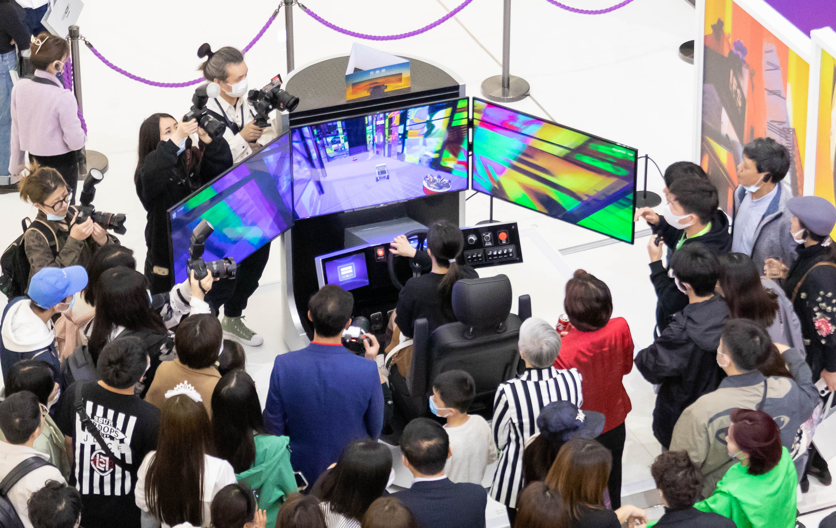 影像装置外侧,由希迪智驾结合胡介鸣《图像宫殿》开发的人工智能驾驶体验游戏—“Meta-Mine”智能驾驶舱吸引了大众的高度关注并纷纷参与体验。该游戏通过对《图像宫殿》的精密数字化创作,最大程度地仿照了希迪智驾在矿山的实际场景与基于人工智能技术的自动驾驶算法协作。大众可在这两个驾驶舱内通过“驾驶游戏”穿越图像时空,控制自动驾驶矿卡模型在虚拟数字化的艺术装置中穿梭、采矿,以不同角度对《图像宫殿》进行观察,并体验城市在地文化。