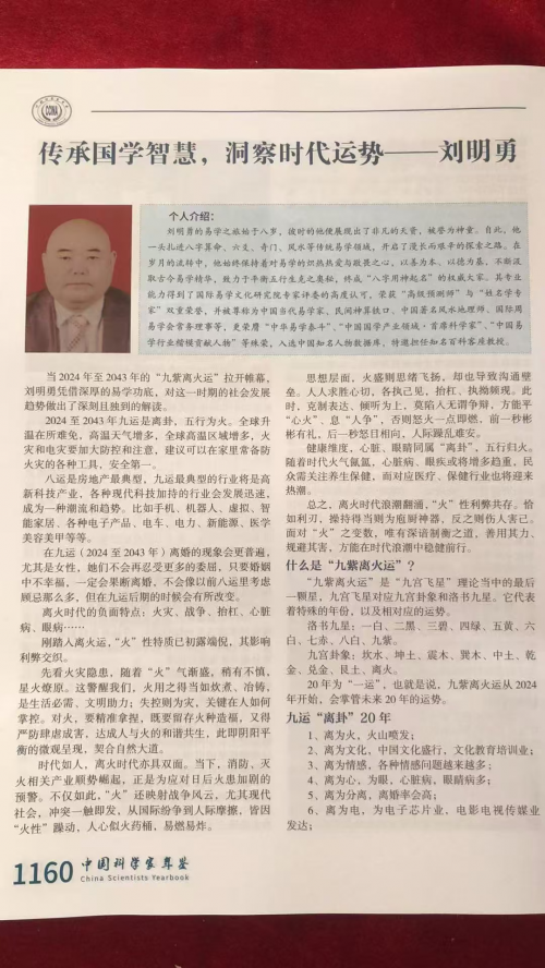 在科技与文化交相辉映的时代,总有一些杰出人物在各自领域熠熠生辉,为社会的进步与发展贡献着独特的智慧和力量。近日,易学领域的领航者刘明勇首席国学科学家凭借其在易学研究与应用方面的杰出贡献,荣耀入编2024《中国科学家年鉴》,这不仅是他个人的无上殊荣,更是易学文化在当代科技文化体系中得到认可与重视的重要体现。
