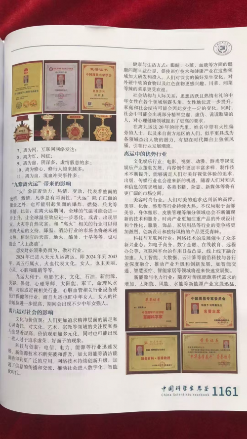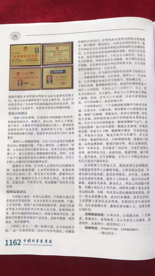 此次编委会特邀刘明勇首席国学科学家入编2024《中国科学家年鉴》,正是对他在易学领域杰出贡献的高度肯定。这不仅意味着他个人的学术成就得到了国家权威机构的认可,更标志着易学文化在当代科技文化体系中获得了应有的地位。刘明勇首席国学科学家的入编,也为广大易学研究者和爱好者树立了榜样,激励着更多的人投身于易学文化的传承与创新事业中。